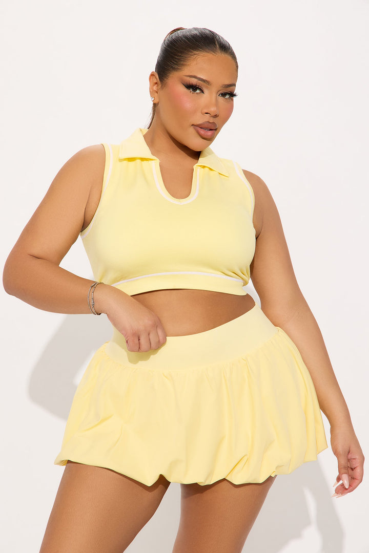 Available In Butter Yellow And White. | Sports Bra | Collar | Sleeveless | Flex Seamless | Contrast Stitching | Medium Impact | Stretch | Pair With "Social Sport Active Bubble Skirt" | 92% Nylon 8% Elastane | Imported