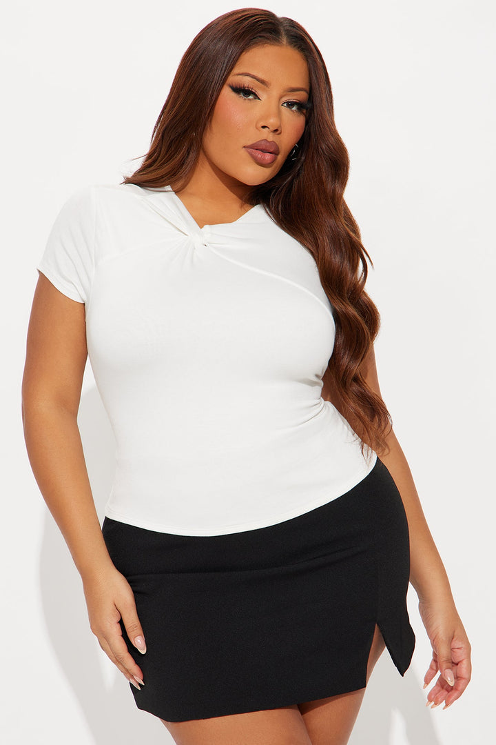 Available In Ivory. | Baby Tee | Sleeveless | Twist Detail | Ruched | Seaming | Double Lined Front | Stretch | Self: 95% Rayon 5% Spandex | Imported