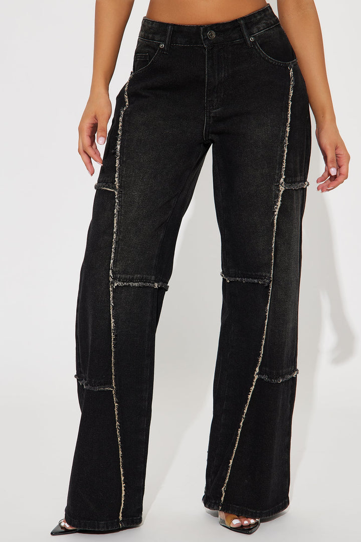 Available In Black Wash And Medium Wash. | Wide Leg Jean | 5 Pocket | Fray Detail | 9.5" Mid Rise | 32" Inseam | 100% Cotton | Non-Stretch | Disclaimer: Due To The Specialized Wash & Distressing Process, Each Garment Is Unique. | Imported