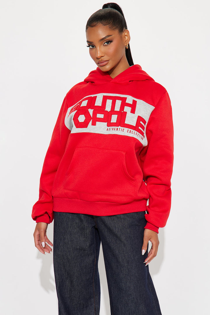 Available In Red. | Hoodie | Long Sleeve | Front Screen | Front Pocket Detail | Stretch | 70% Polyester 30% Cotton | Imported
