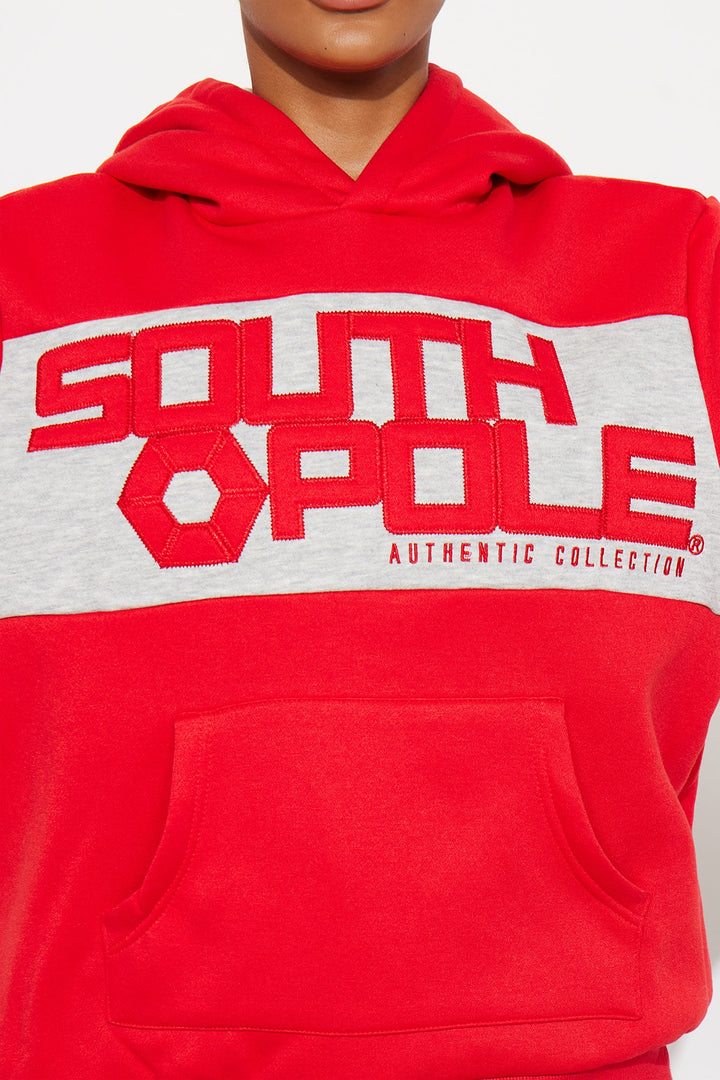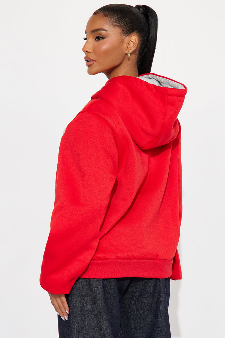 Available In Red. | Hoodie | Long Sleeve | Front Screen | Front Pocket Detail | Stretch | 70% Polyester 30% Cotton | Imported
