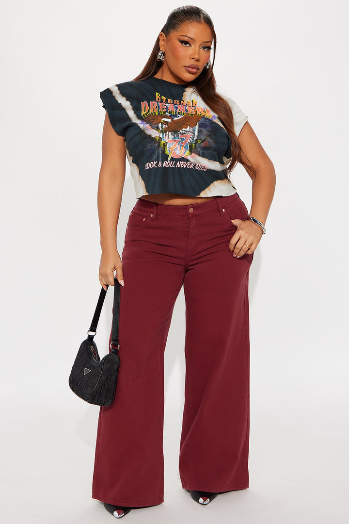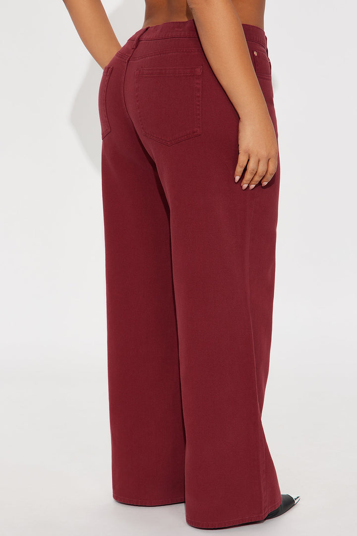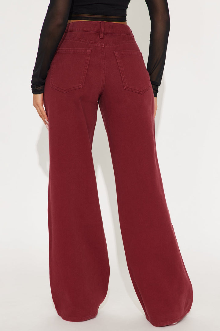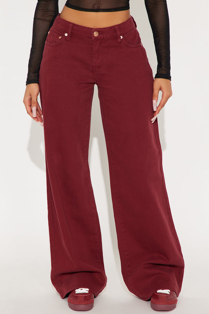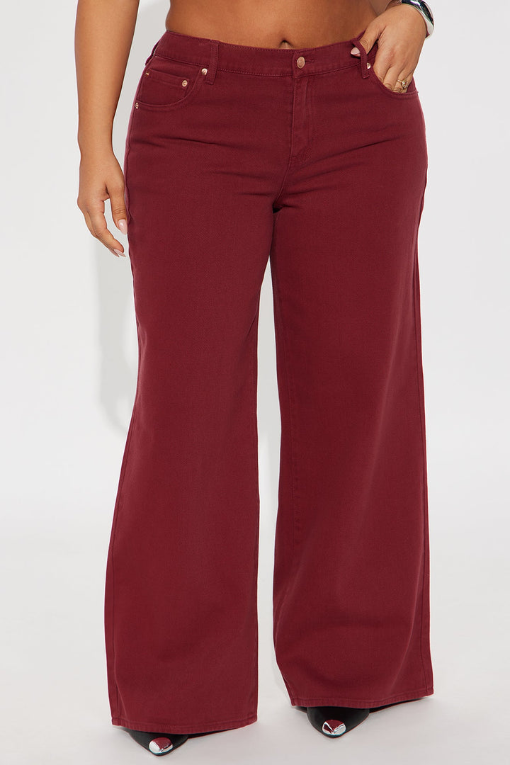 Available In Brown, Stone And Wine. | Wide Leg Jean | 5 Pocket | Non-Stretch | 33" Inseam | 9" Low Rise | Disclaimer: Due To The Specialized Wash, Each Garment Is Unique. | 100% Cotton | Imported