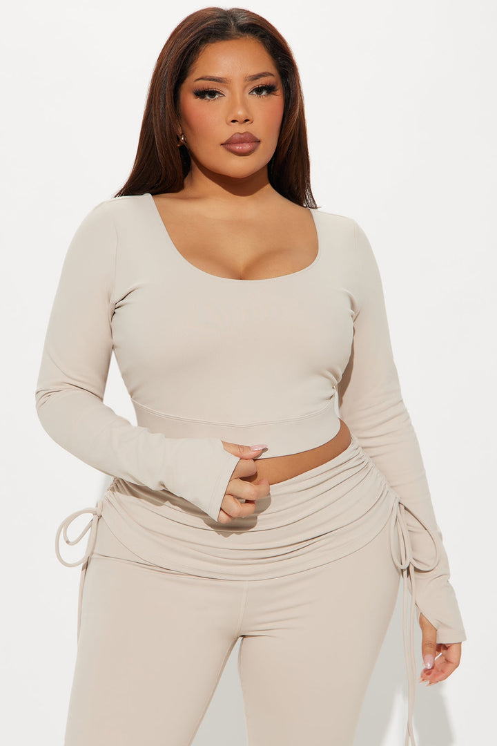 Available In Black, Light Taupe And Sage. | Active Top | Scoop Neck | Long Sleeve | Super Soft | Cut Out | Twist Detail | Medium Impact | Stretch | Pair with "First Position Super Soft Active Pant" | Body: 77% Polyester 23% Spandex | Inner Mesh: 82% Nylon 18% Spandex | Imported
