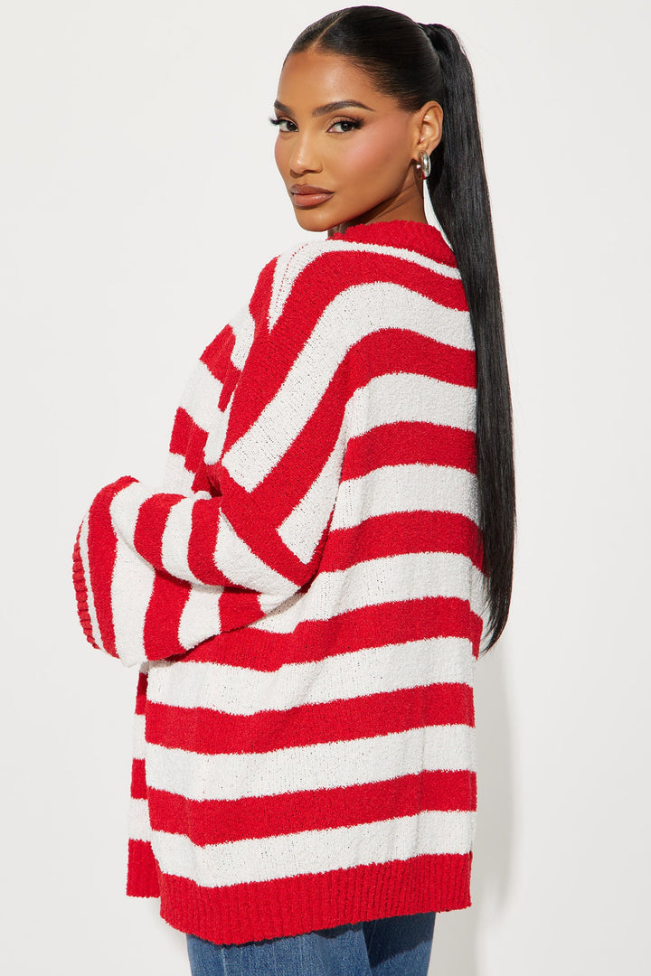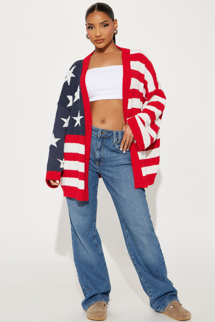 Available In Red/combo. | Cardigan Sweater | American Flag Print | Long Sleeve | V Neck | Open Front | Oversized | Ribbed Hem | Disclaimer: Pattern Placement May Vary | 100% Polyester | Imported