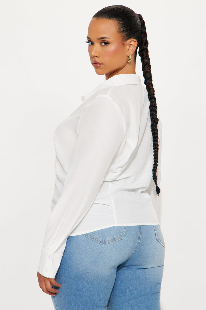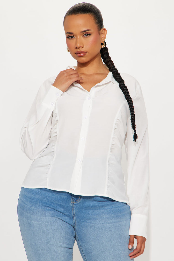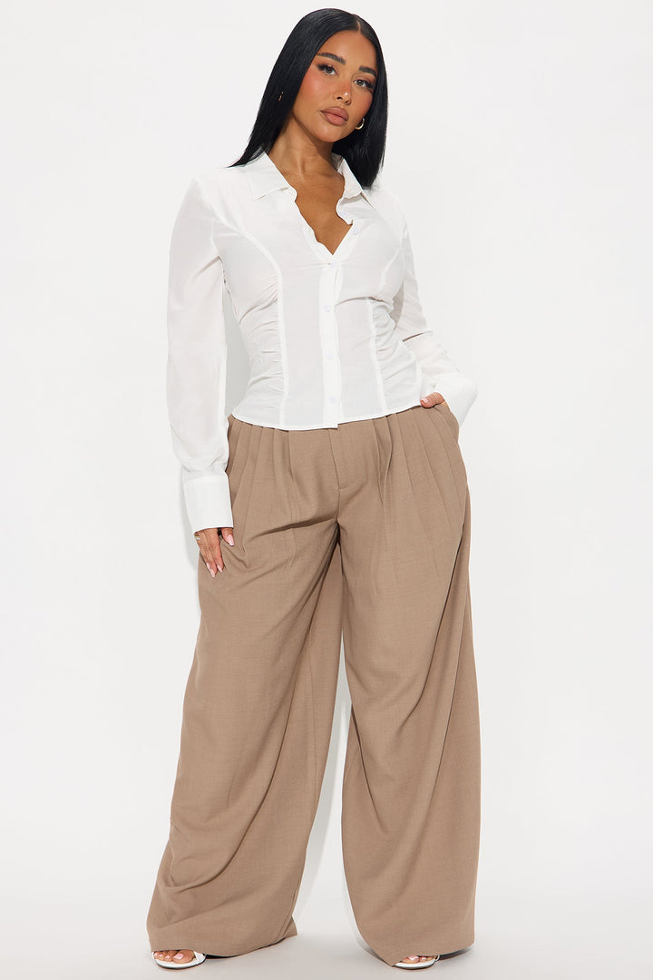Available In Taupe And White. | Challis Shirt | Button Up | Ruched Detail | Non Stretch | 65% Rayon 35% Polyester | Imported