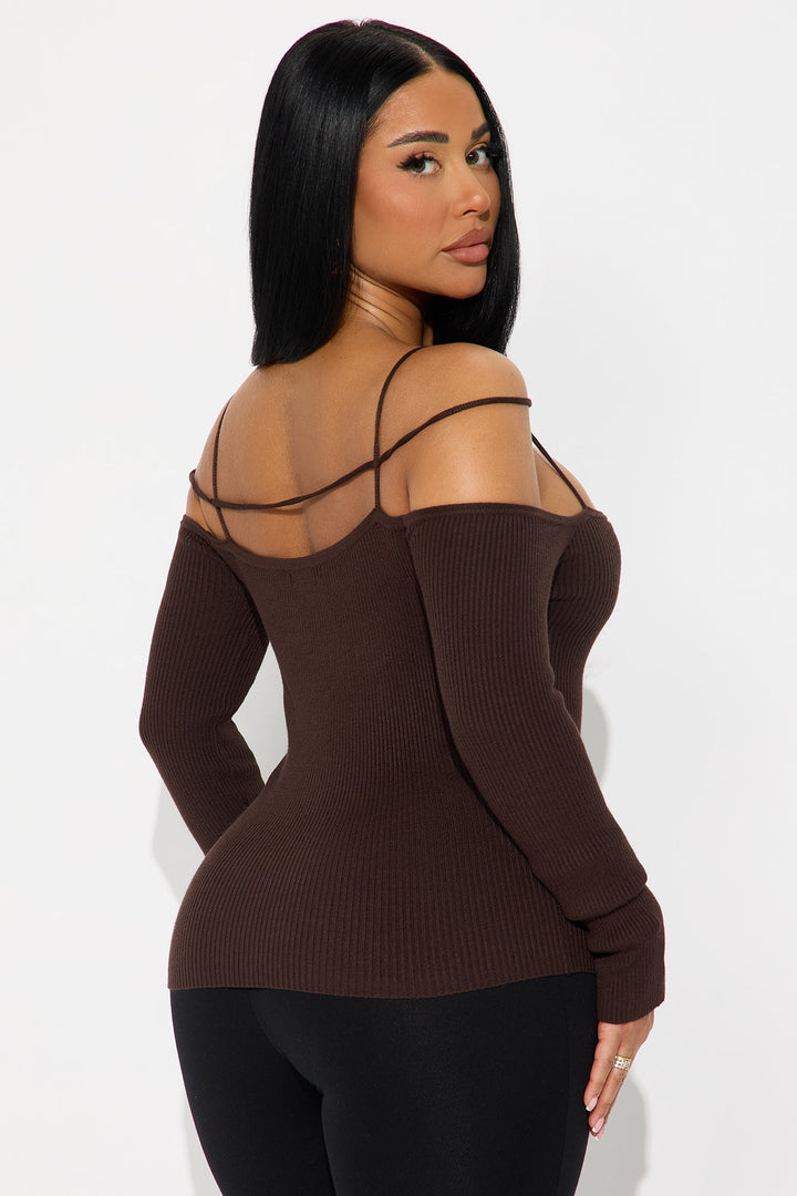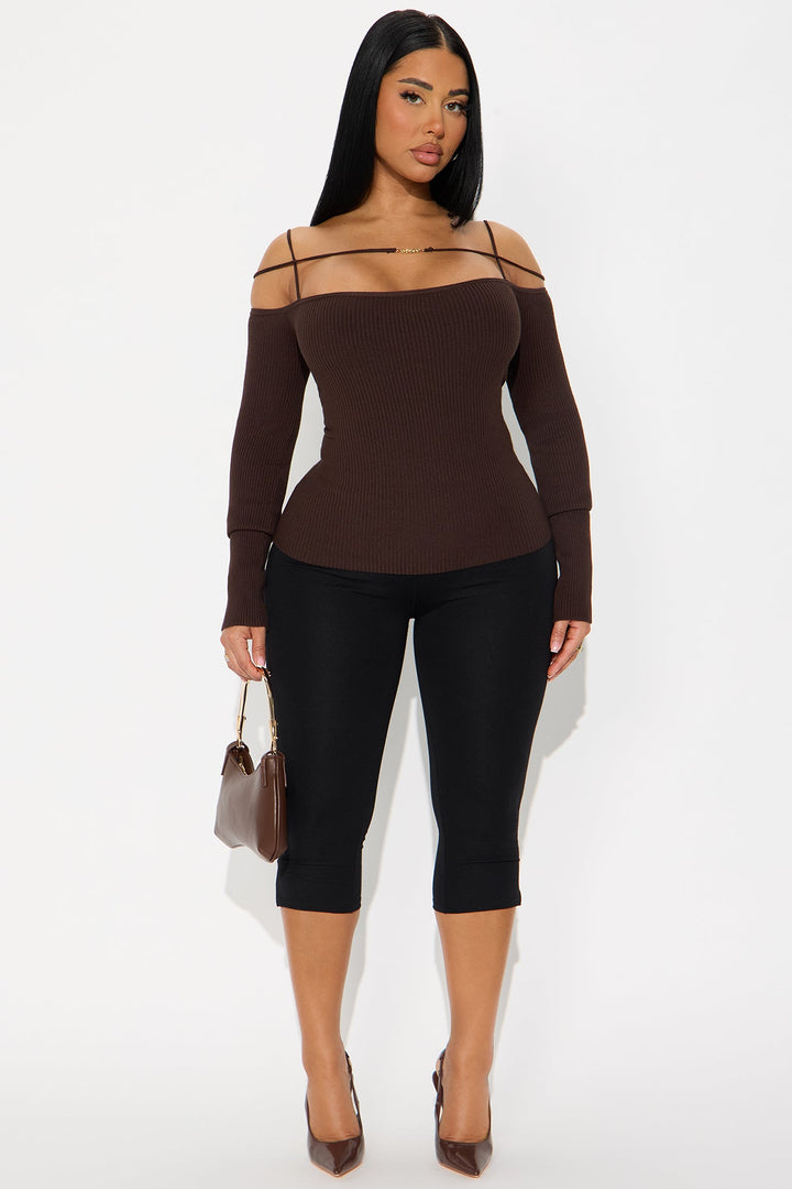 Stay Dramatic Off Shoulder Strappy Sweater Top - Chocolate