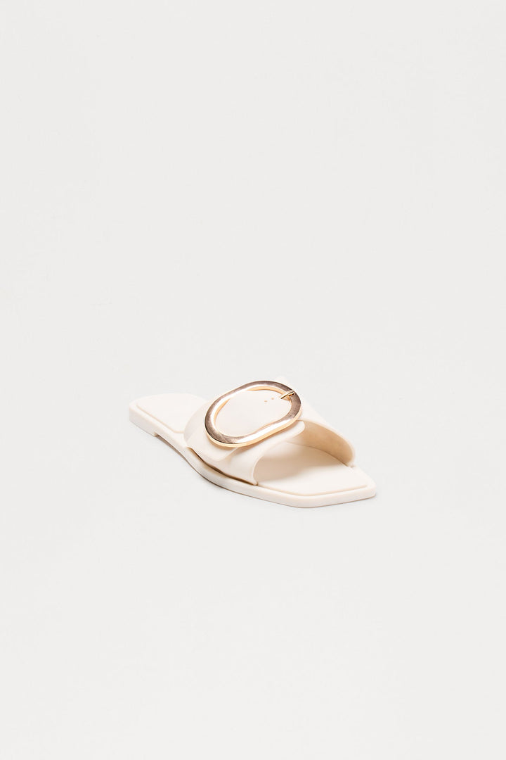 Available In Black And Ivory. | Flat Sandals | Slip On | Hardware Buckle Detail | Square Toe | Flat Heel | Imported