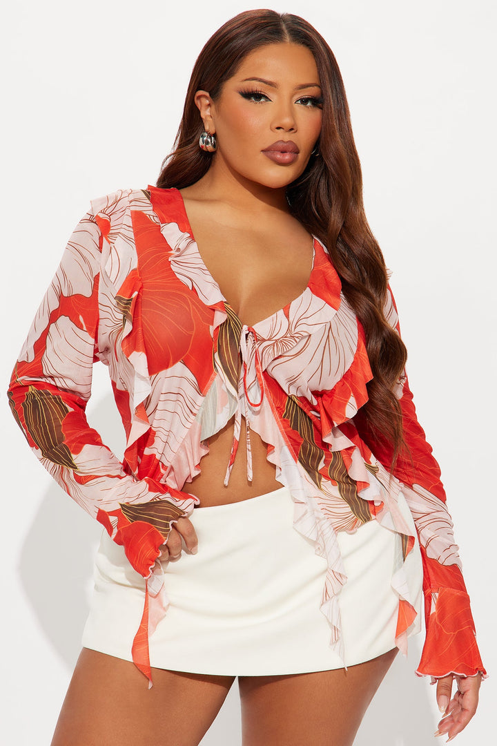Available In Multi Color. | Flyaway Top | Stretch | Long Sleeve | Bell Sleeve | Tie Front | Ruffle Detail | Mesh | Disclaimer Print Placement May Vary | Self: 95% Polyester 5% Spandex | Imported