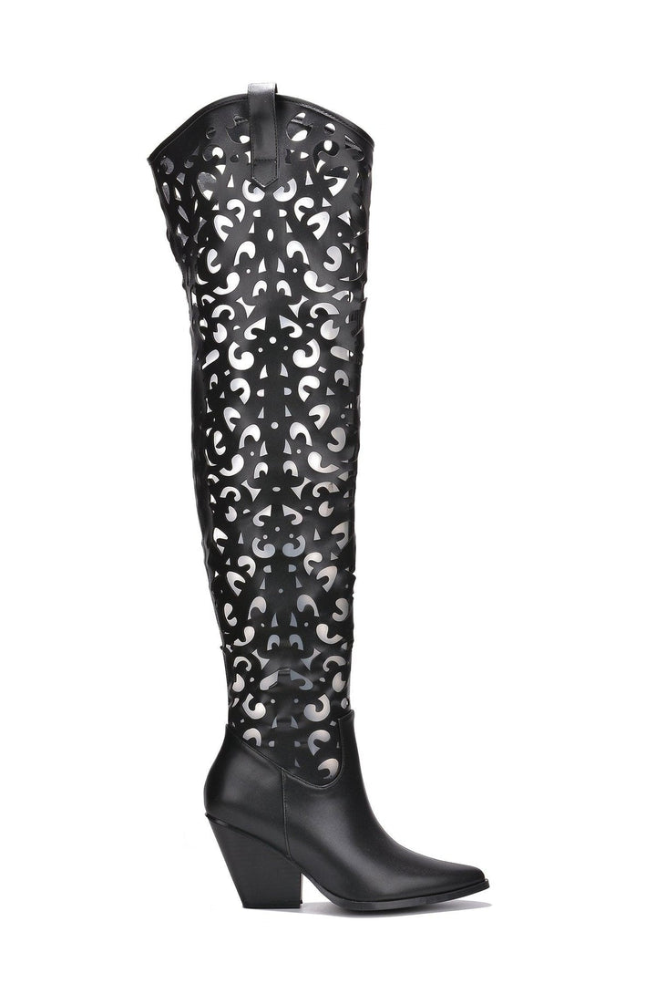 STIVALE - BLACK - BOOTS by CAPE ROBBIN closed pointy toe thigh high cowboy boots cutout memory foam footbed 2.5 inch mid block heels zipper closure metallic PU These Stivale boots are the perfect blend of Western charm and urban style. With their thigh high length and delicate design,they're sure to bring a bit of sass to any outfit.