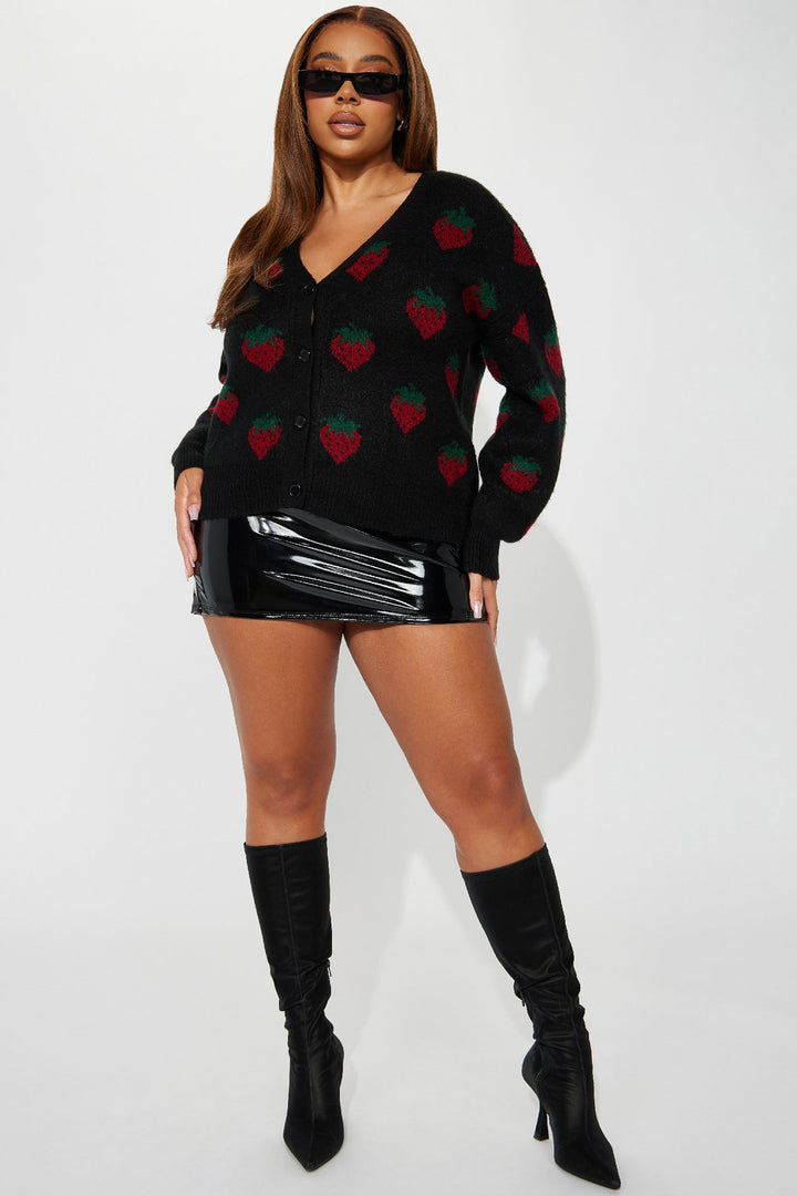 Available In Black/combo. | Cardigan Sweater | Long Sleeve | Button Front | Strawberry Print | 76% Acrylic 20% Polyester 4% Spandex | Imported