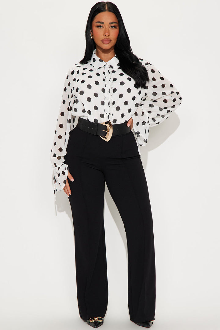 Available In Black/White And White/Black. | Polka Dot Shirt | Button Front With Ruffle Detail | Bell Sleeves With Adjustable Ties | Collar | Self / Lining 100% Polyester | Imported