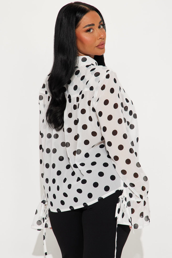 Available In Black/White And White/Black. | Polka Dot Shirt | Button Front With Ruffle Detail | Bell Sleeves With Adjustable Ties | Collar | Self / Lining 100% Polyester | Imported