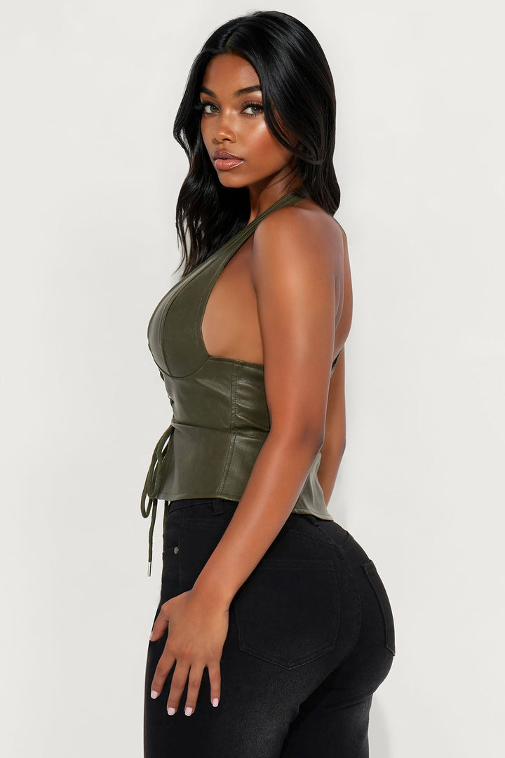 Available In Olive. | Halter Top | Faux Leather | Lace Up | Shell: Coating: 100% Polyurethane | Ground: 100% Polyester | Lining: 100% Polyester | Imported