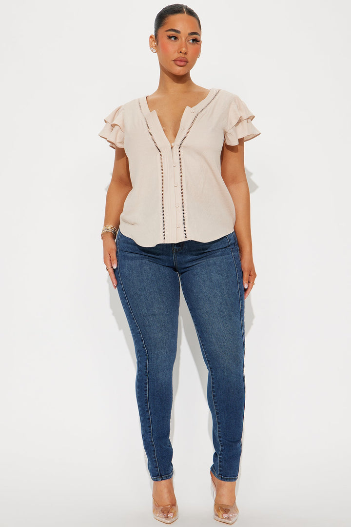 Available In Beige, Off White And Olive. | Linen Blouse Top | Button Front | Ruffle Cap Sleeve | 55% Polyester 45% Rayon | Imported