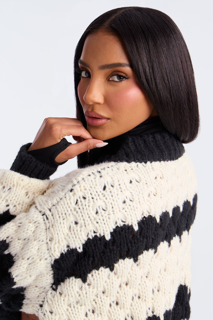 Available In Black/White And Brown Combo. | Cardigan | Striped | Chunky Knit | Open Front | 79% Polyester 21% Acrylic | Imported