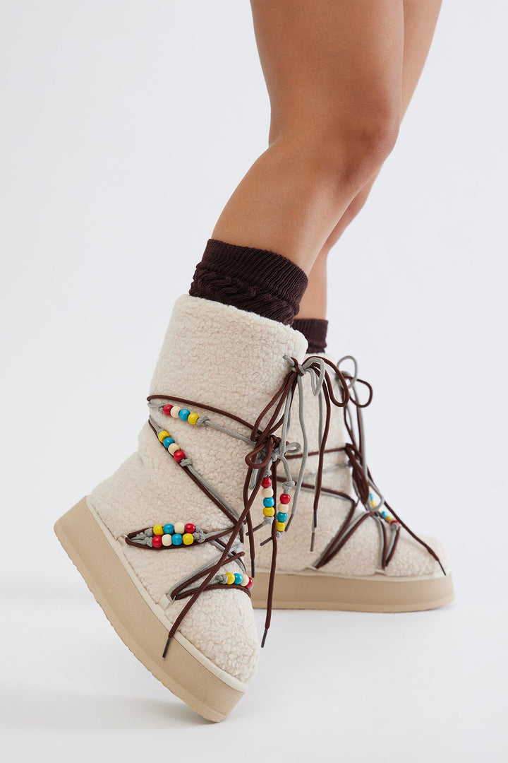 Available In Beige. | Flat Boots | Sherpa | Beaded Detail | Lace Up Detail | Round Toe | Low Platform Heel | Imported
