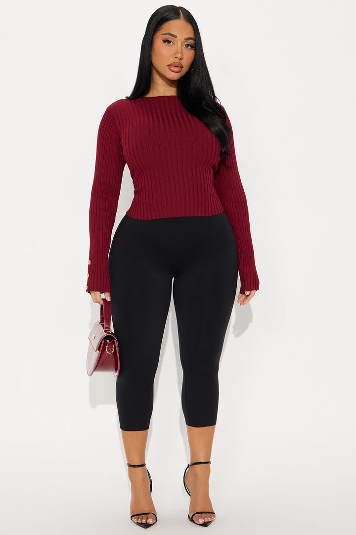 Available In Black, Burgundy And Ivory. | Pullover Sweater | Boat Neck | Scoop Back | Hardware Detail On Sleeve | Self: 80% Viscose 20% Nylon | Imported