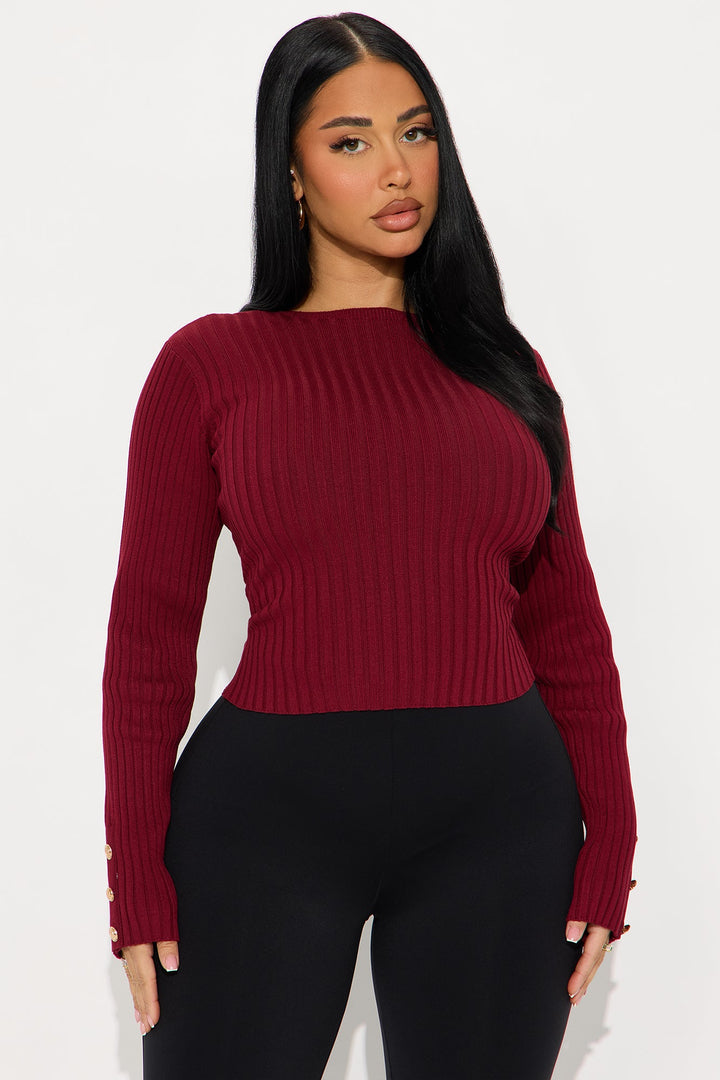 Available In Black, Burgundy And Ivory. | Pullover Sweater | Boat Neck | Scoop Back | Hardware Detail On Sleeve | Self: 80% Viscose 20% Nylon | Imported