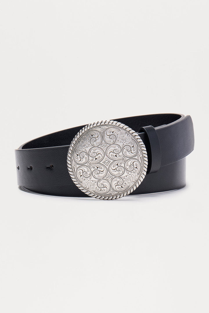 Available In Black And White. | Faux Leather Material | Intricate Round Buckle | Length: 42" | Imported