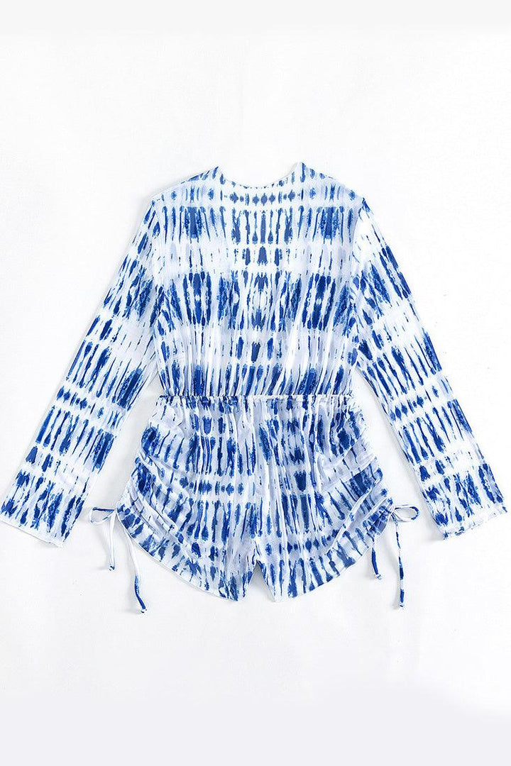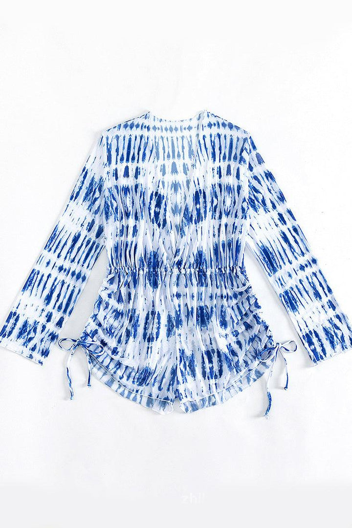 Blue White Tie Dye Plunging-V Mesh Long Sleeves Romper Cover-Up