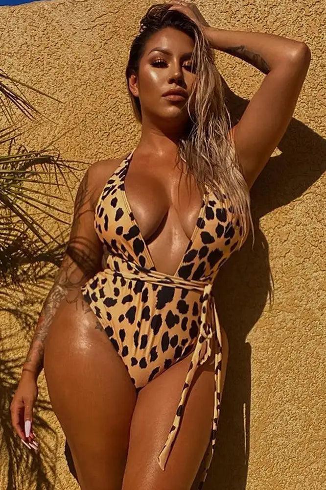 Beige Leopard Print Two Tone Deep V-Cut One Piece Swimsuit