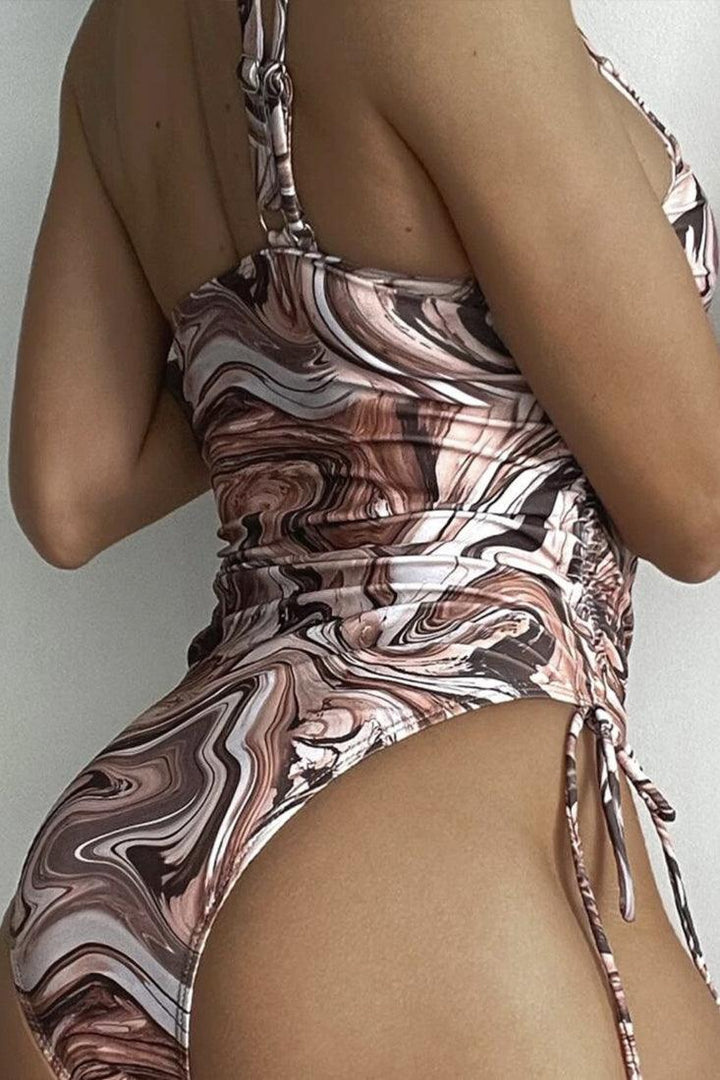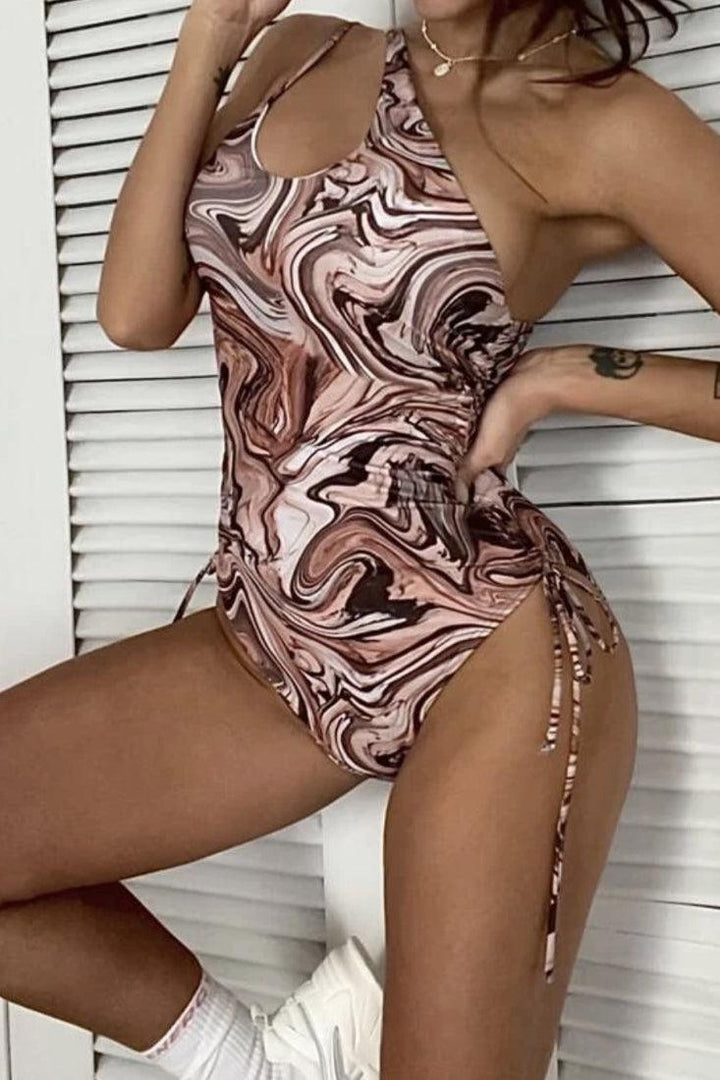 Brown Printed One Shoulder Sexy One Piece Swimsuit