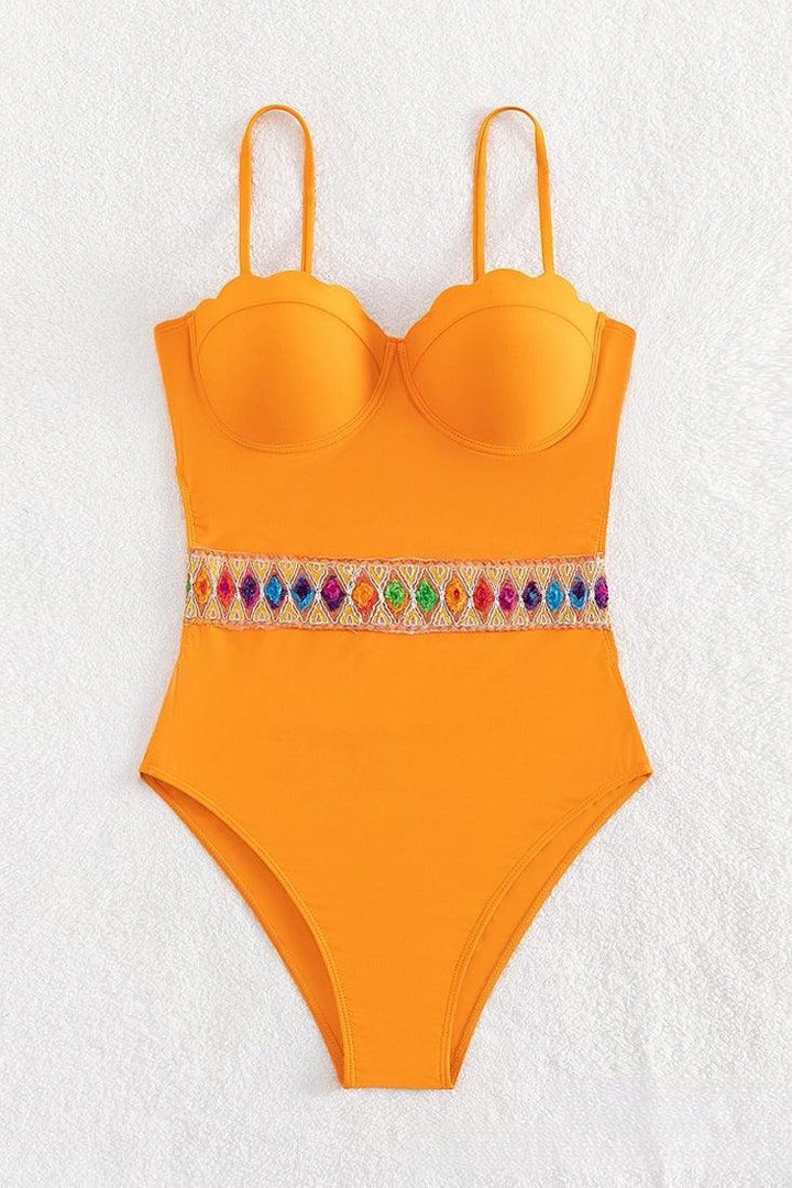 Orange Push-Up Cup Multi Rhinestone Belt Sexy 1Pc Swimsuit Monokini