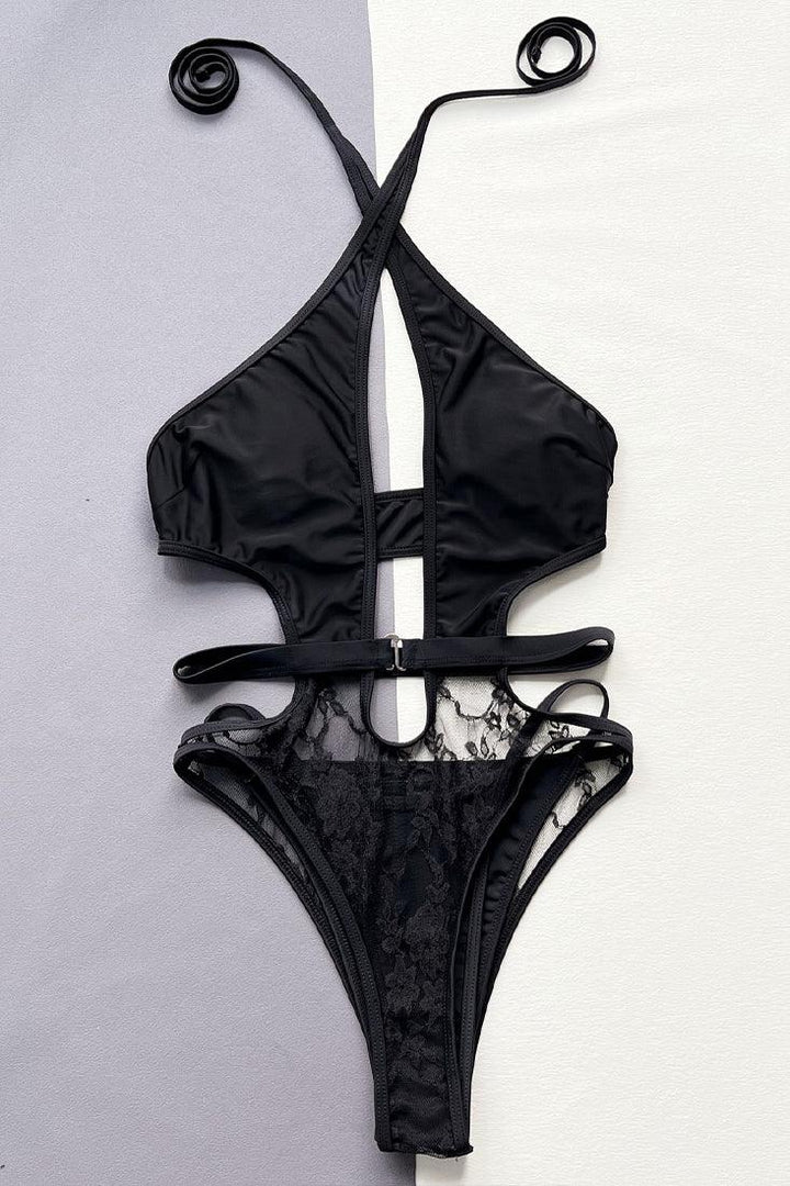 Black Strappy Lace 2 Layer Halter Sexy 2Pc Swimsuit Monokini