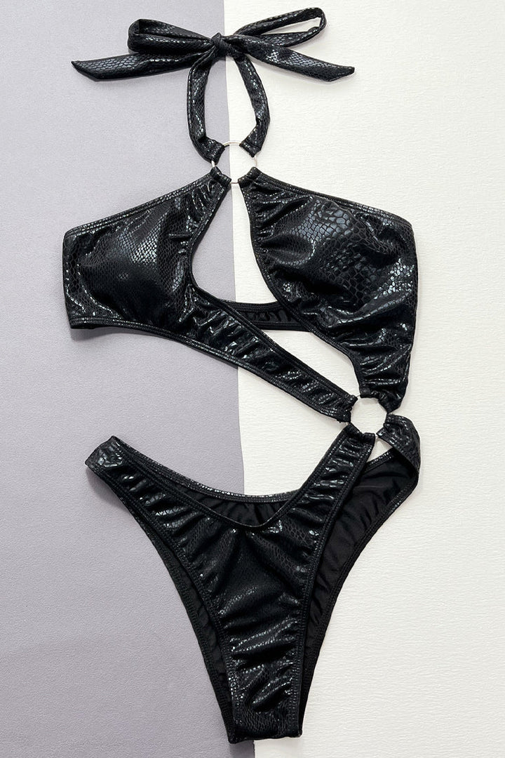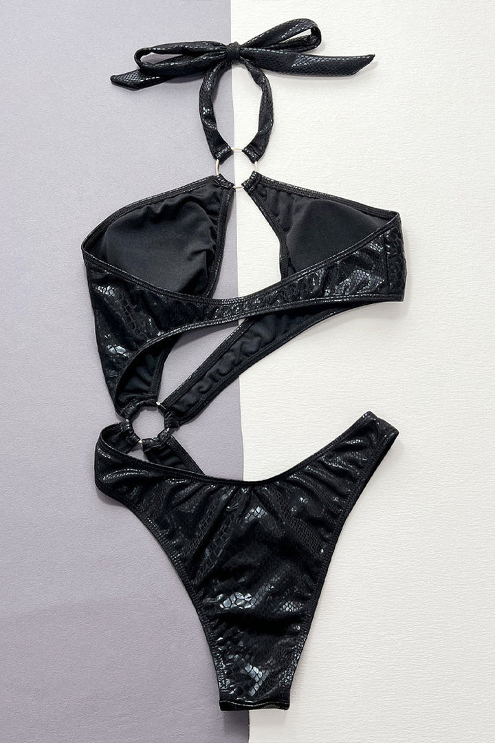 Black Shiny Snake Print Asymmetric Cut-Out O-ring Sexy 1Pc Swimsuit Monokini