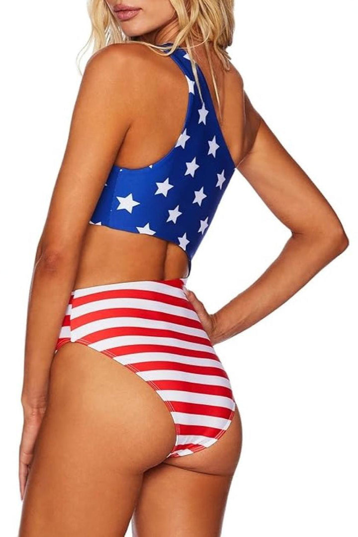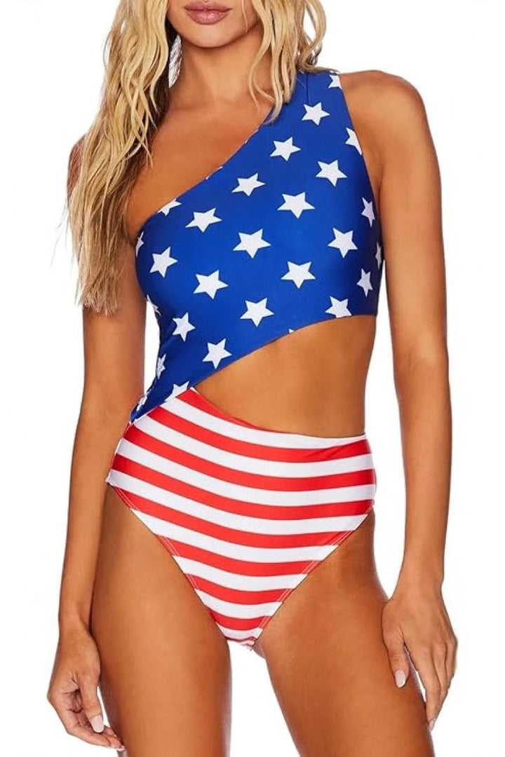 Blue Star Red Stripe Flag Print One Shoulder Cut-Out Sexy 1Pc Swimsuit Monokini