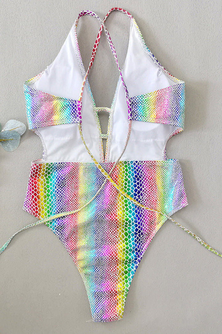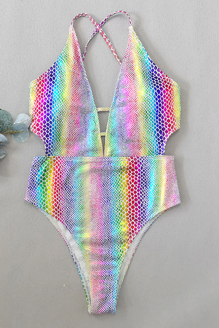 Rainbow Metallic Snake Strappy Sexy Monokini 1Pc Swimsuit