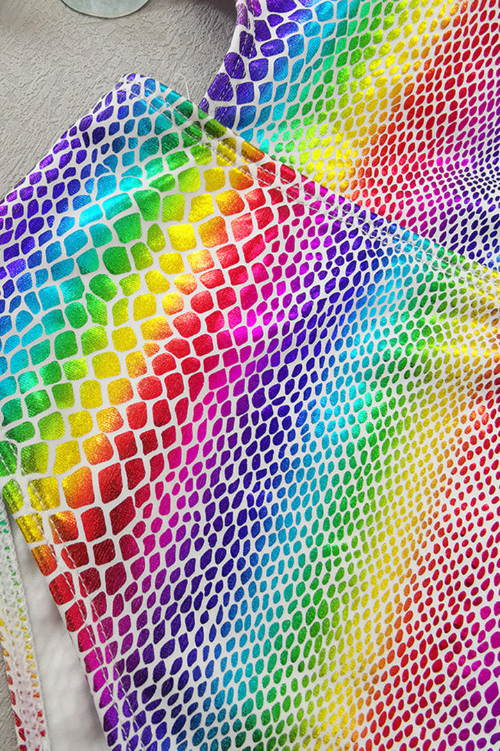 Introducing our Rainbow Metallic Snake Strappy Sexy Monokini 1Pc Swimsuit, a must-have for daring fashionistas. This monokini will have you slithering to the beach with its rainbow metallic design and strappy details. It's the perfect mix of sexy and edgy, sure to make a statement. Bring on the summer fun!