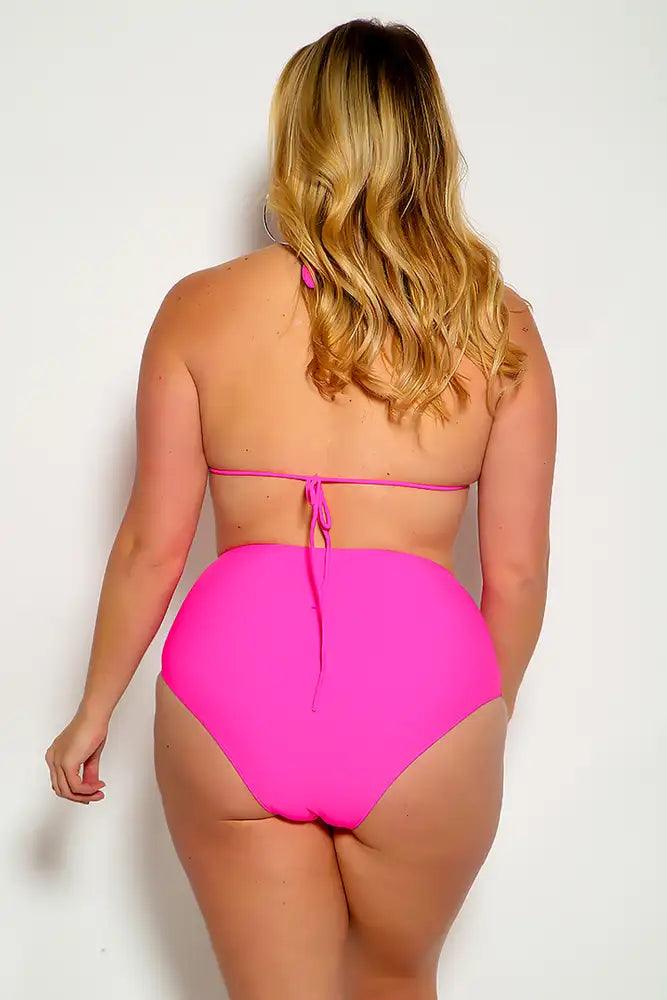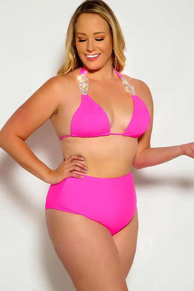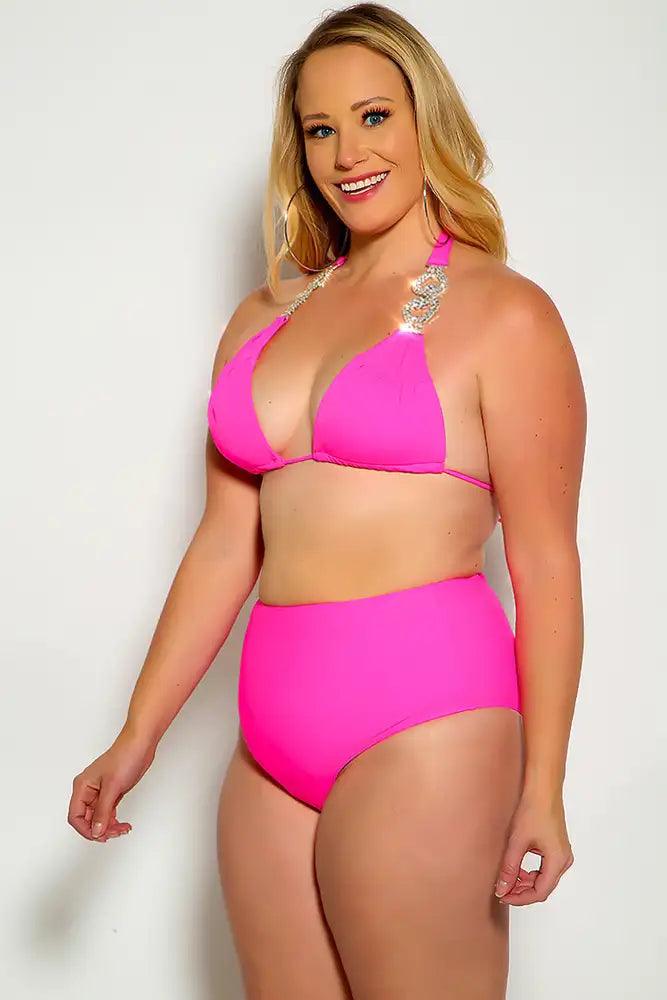 Fuchsia Halter Rhinestone Detail High Waist Plus Size Two Piece Swimsuit