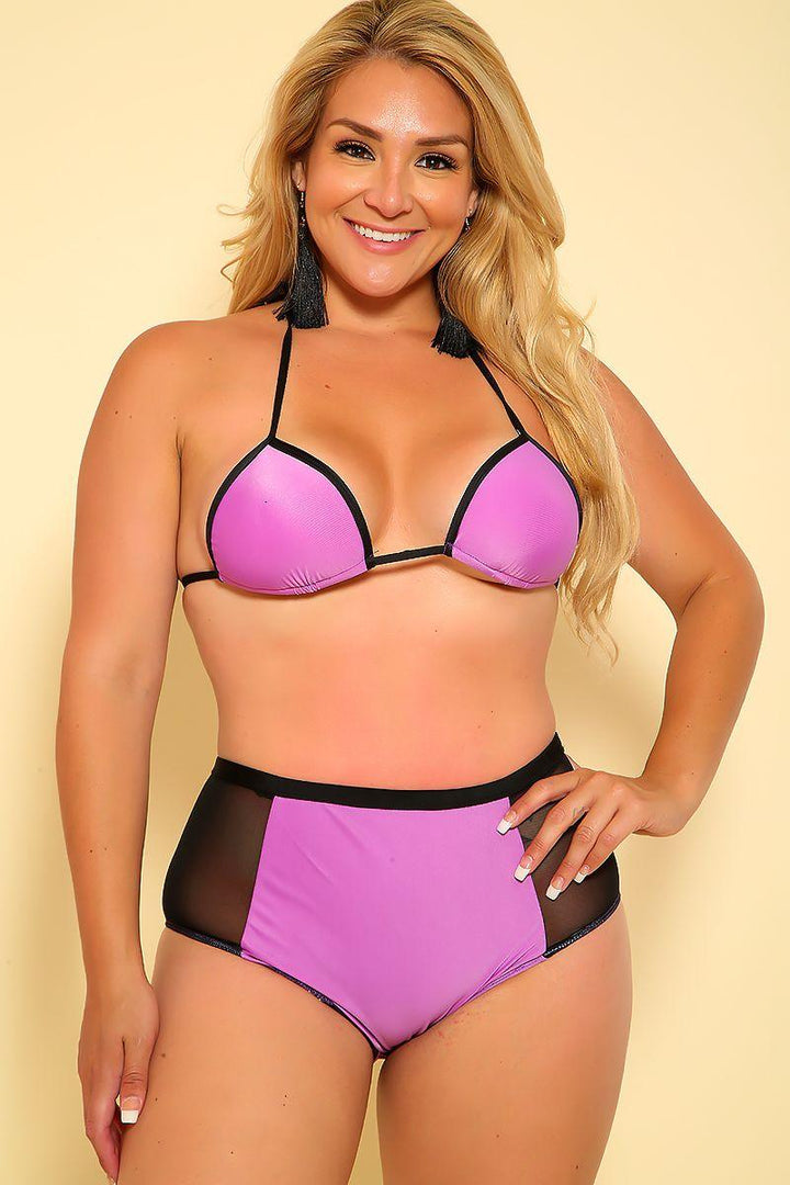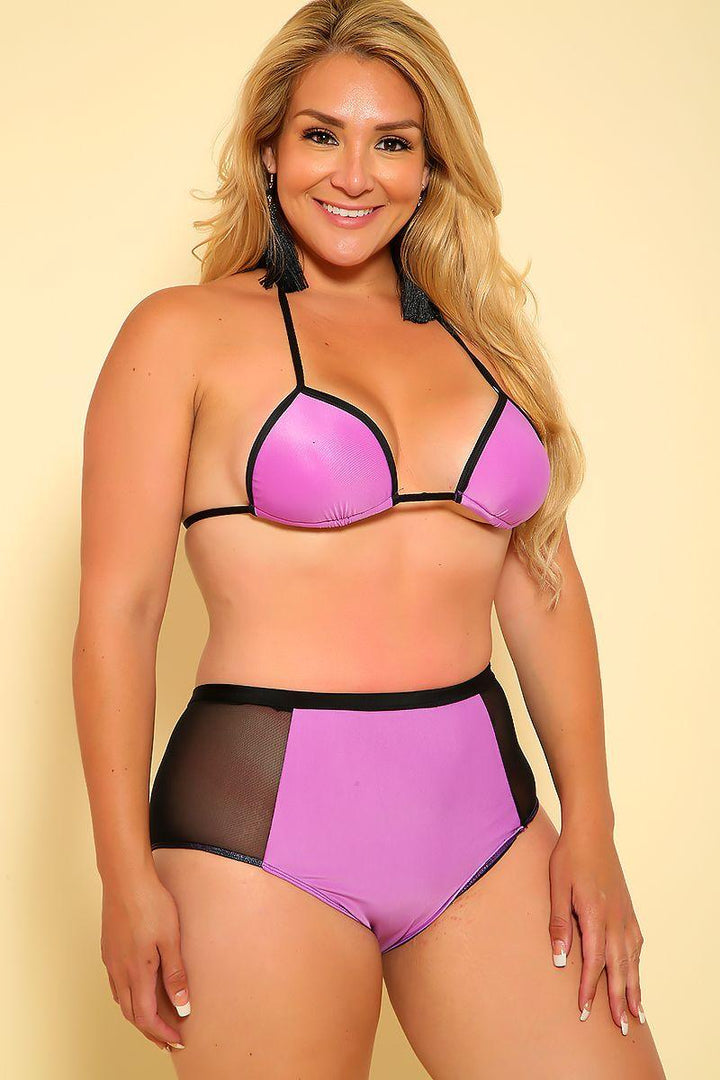 Sexy Purple Black Two Tone Mesh High Waist Plus Size 2Pc. Swimsuit