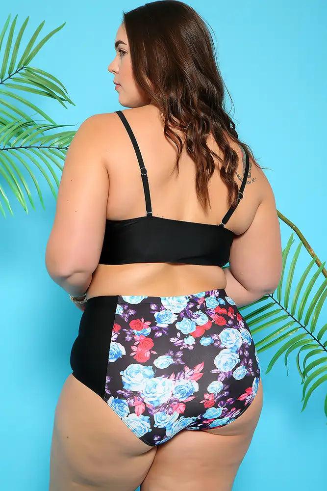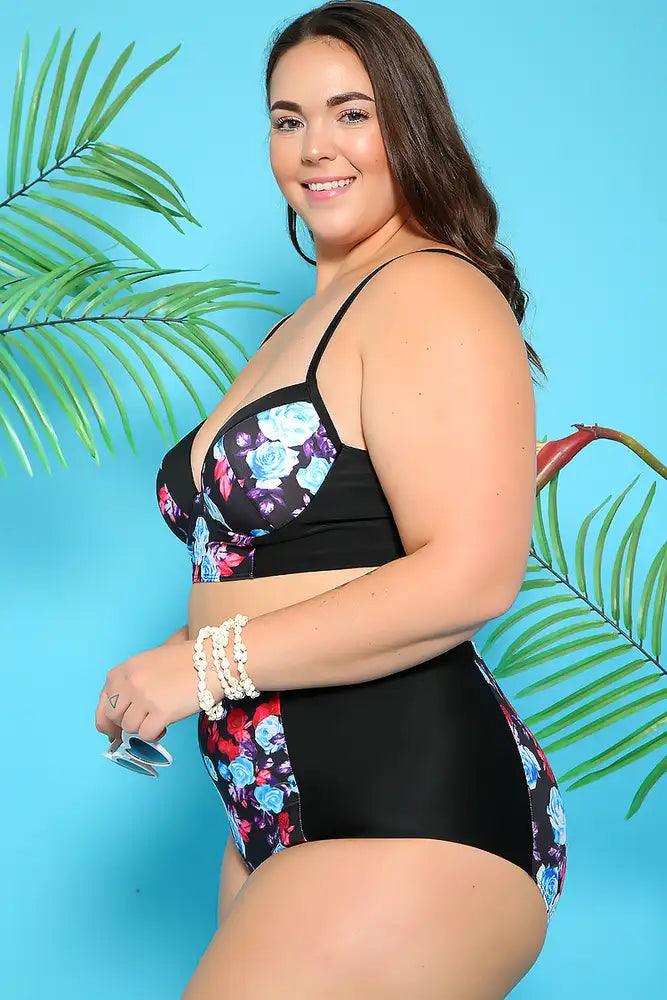 Sexy Black Blue Floral Padded High Waist Plus Size Two Piece Swimsuit