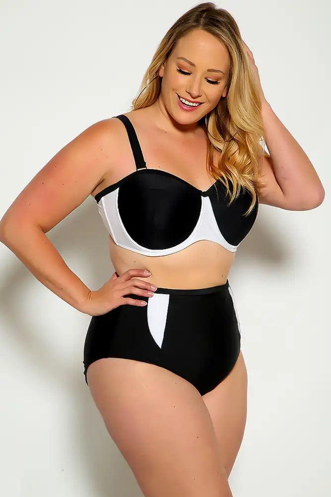 Sexy Black White Two Tone High Waist Plus Size Two Piece Swimsuit