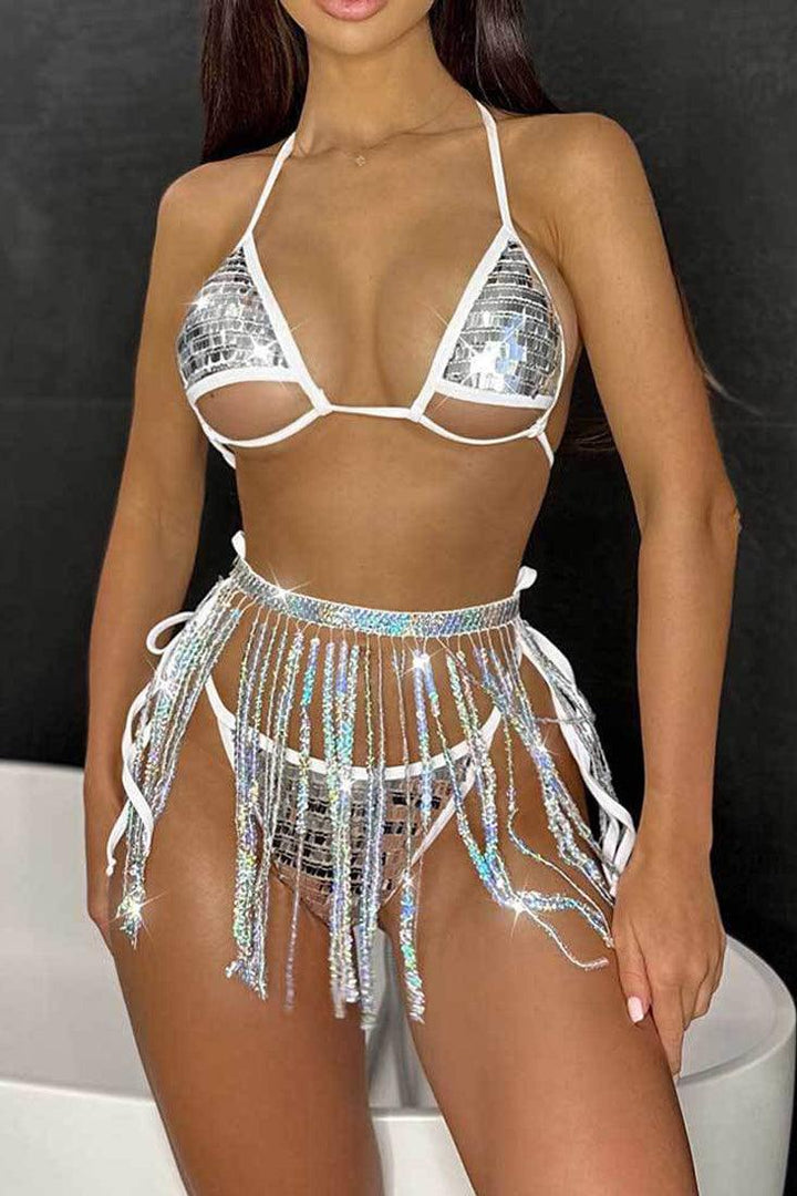Get ready to shine in this Silver White Sequin Cut-Out Strap Fringe 3Pc Swimsuit Set Bikini! With its dazzling sequin design, unique cut-out straps, and playful fringe detail, this swimsuit is made for catching eyes and having fun in the sun. Stand out at the beach or pool in this stylish and flirty bikini set.