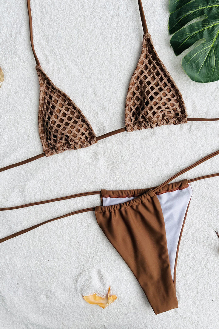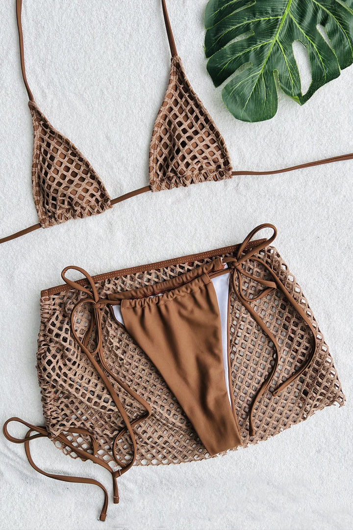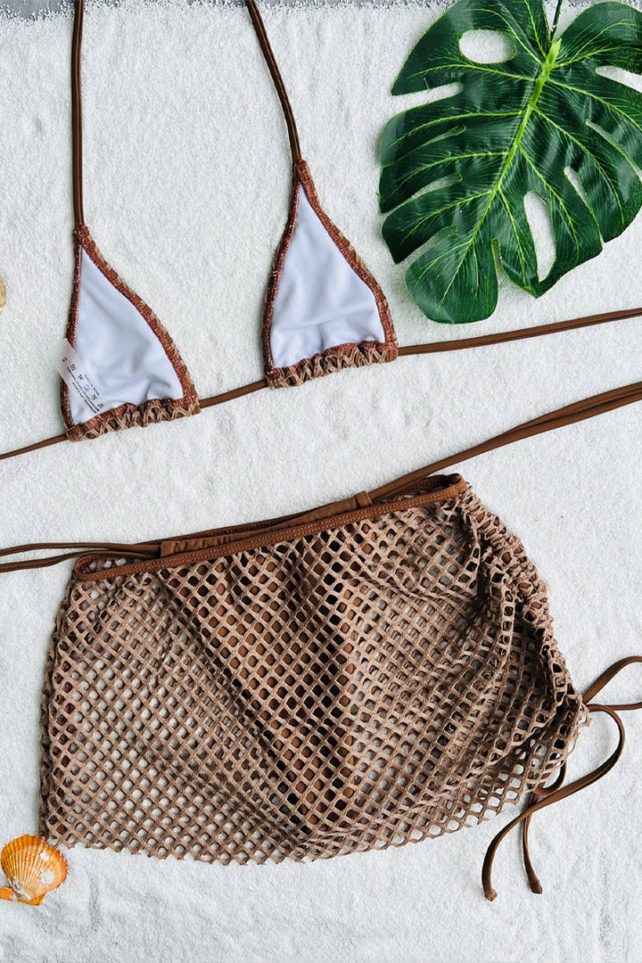 Brown Netted Narrow Top Cheeky Bottom Cover-Up 3Pc Swimsuit Set
