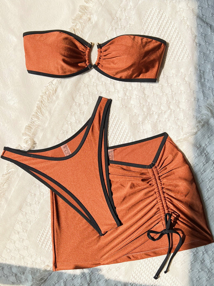 Brown Black U-Wire Bandeau Cheeky Skirt Cover-Up 3Pc Swimsuit Set
