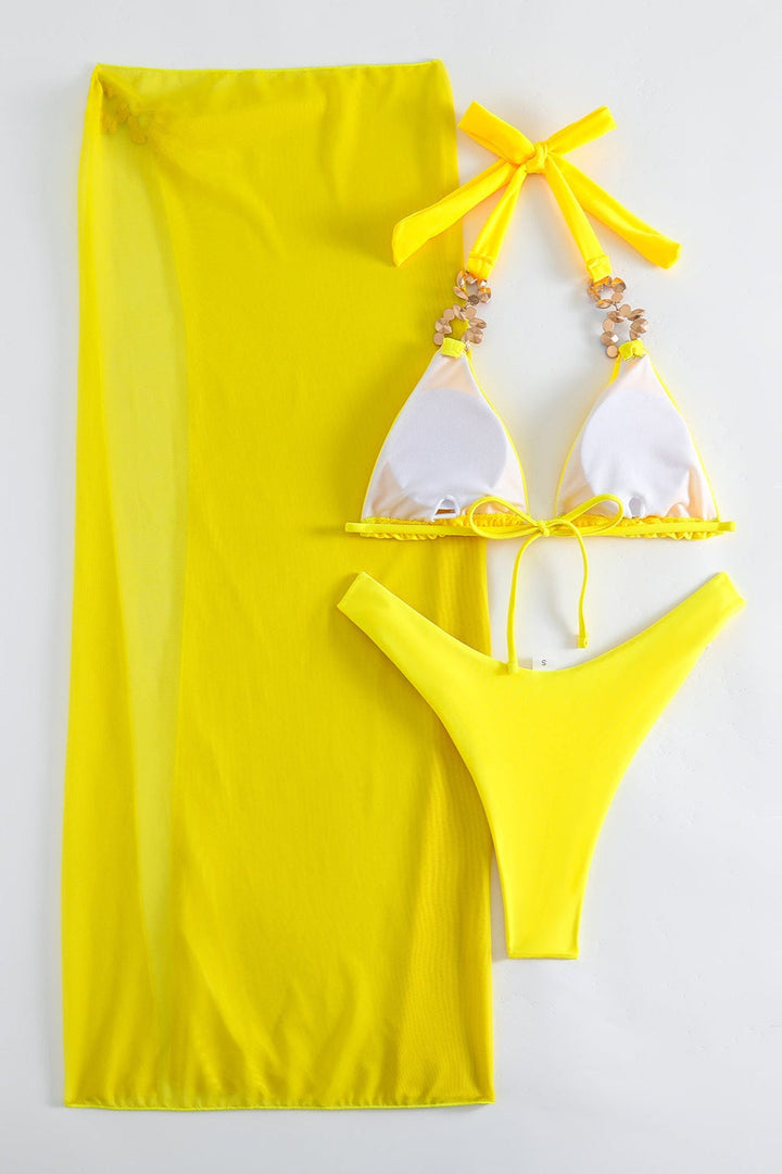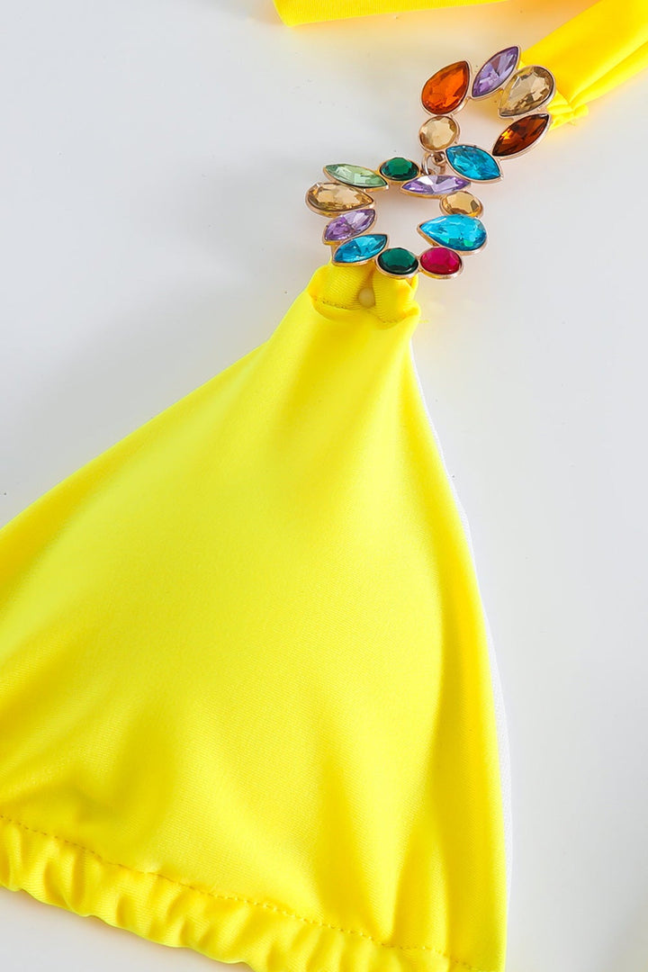 Yellow Rhinestones Gem Halter Cheeky Cover-Up 3Pc Swimsuit Set
