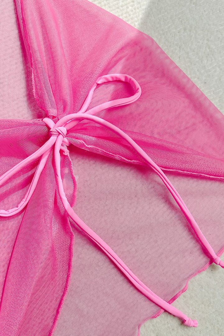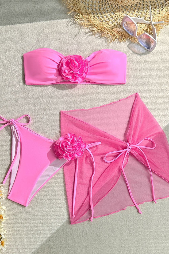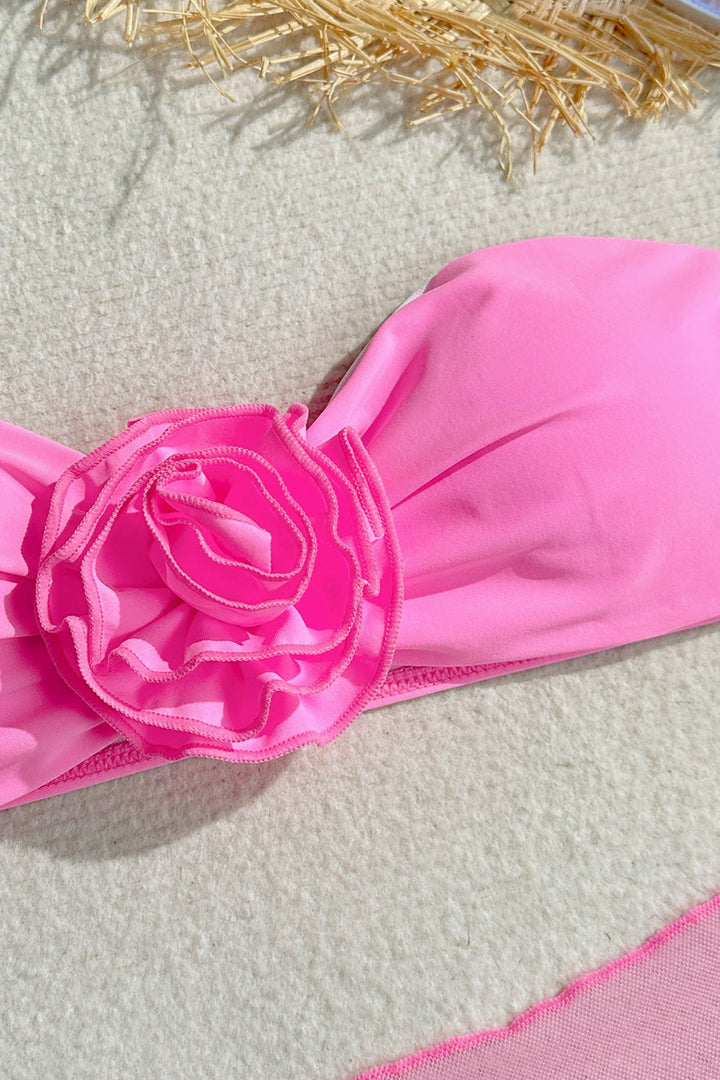 Pink 3D Flower Rosette Bandeau Cheeky Mesh Cover-Up Sexy 3Pc Swimsuit Set