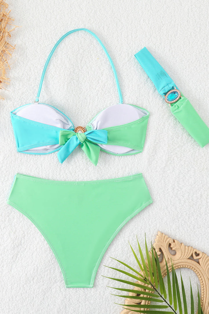 Green Blue Gemstone Rhinestone Headband/Belt 3Pc Sexy Swimsuit Set