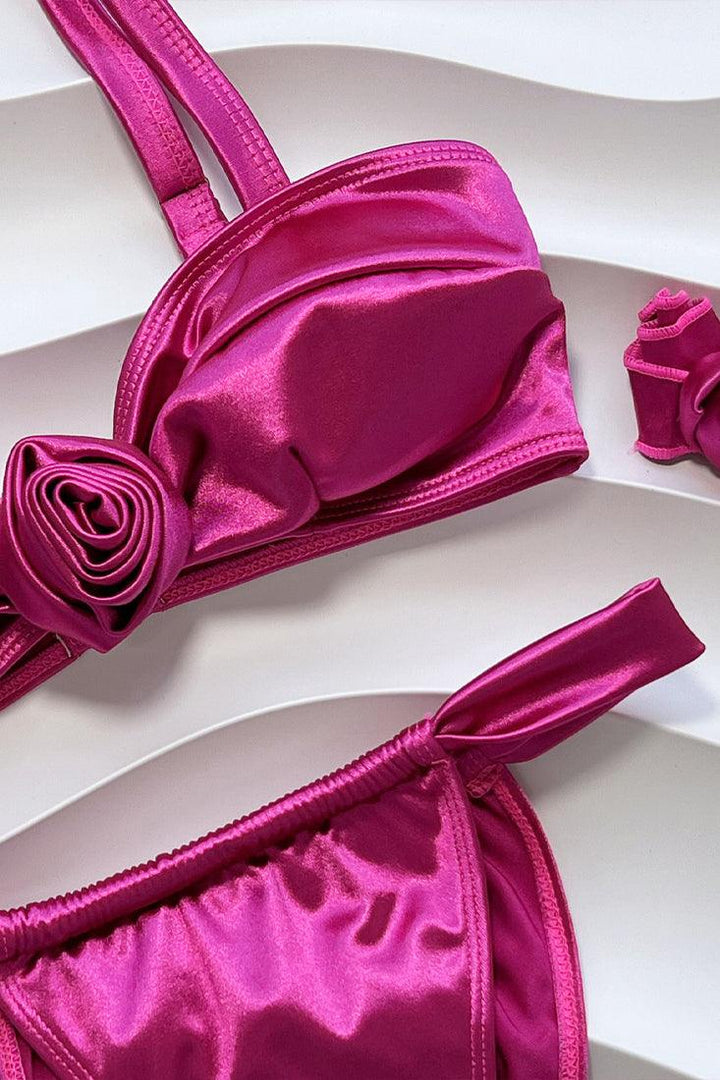 Fuchsia Pink Satin Stretchy Ruched Cheeky Rosette 3Pc Swimsuit Set Bikini