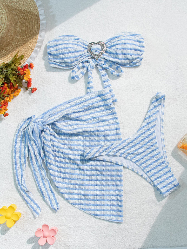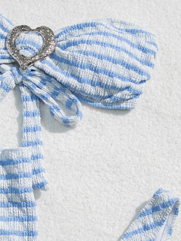 Blue White Stripe Textured Silver Heart Buckle Bandeau Cover-Up 3Pc Swimsuit Set