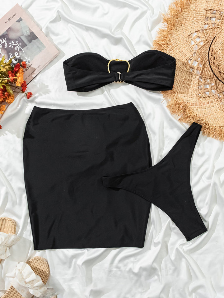 Turn heads at the beach or pool with this playful 3-piece swimsuit set featuring a black and gold abstract design. The bandeau top offers a chic, strapless look, while the cheeky bottoms add a flirty touch. Complete with a matching cover-up, this set lets you effortlessly switch from swim to stroll in style. Perfect for making a bold statement under the sun!
