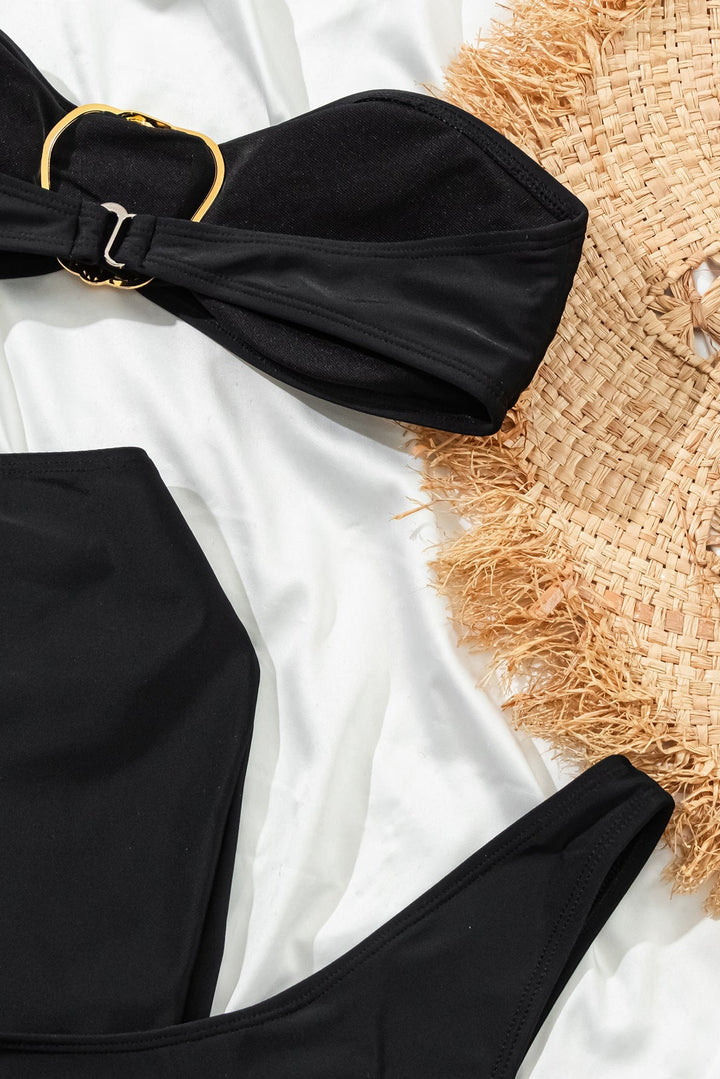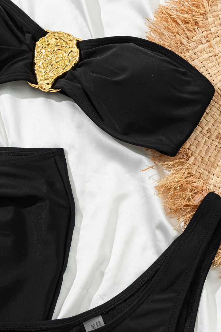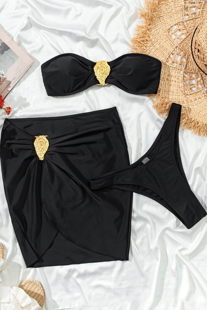 Black Gold Abstract Decor Bandeau Cheeky Cover-Up 3Pc Swimsuit Set