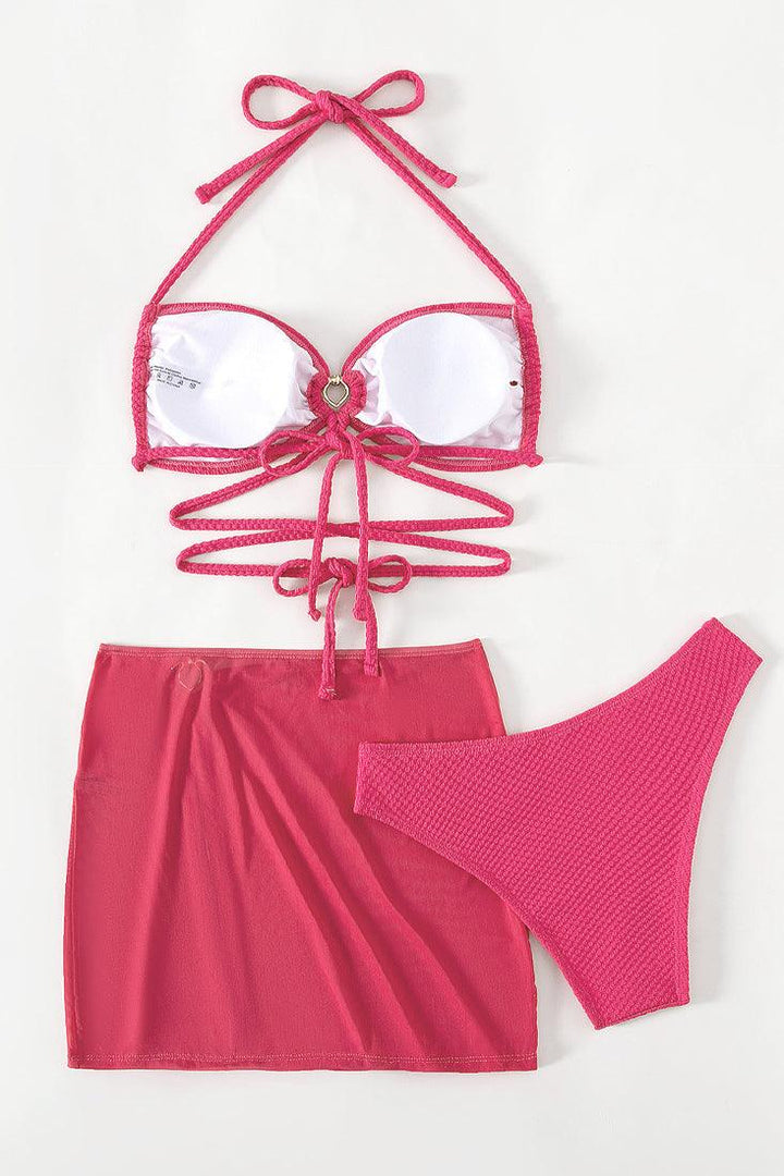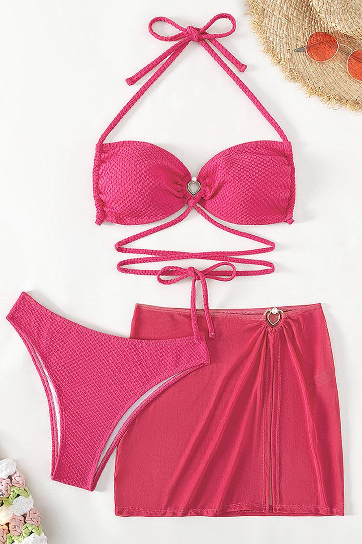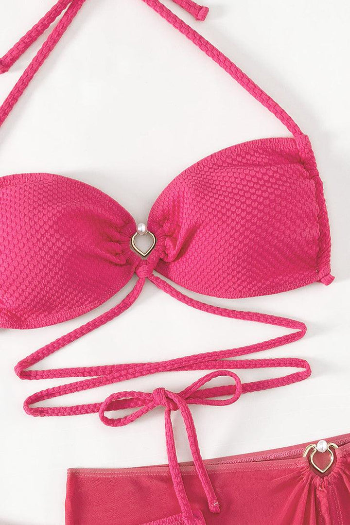 Hot Pink Pearl Heart Ring Bandeau Halter Cover-Up 3Pc Swimsuit Set