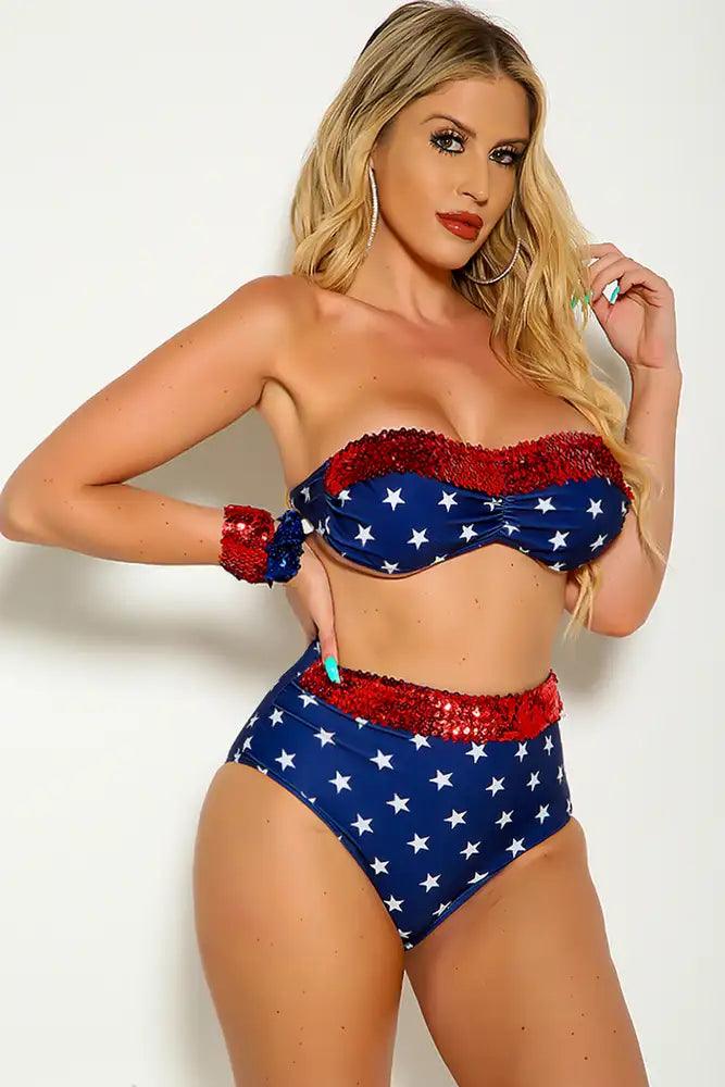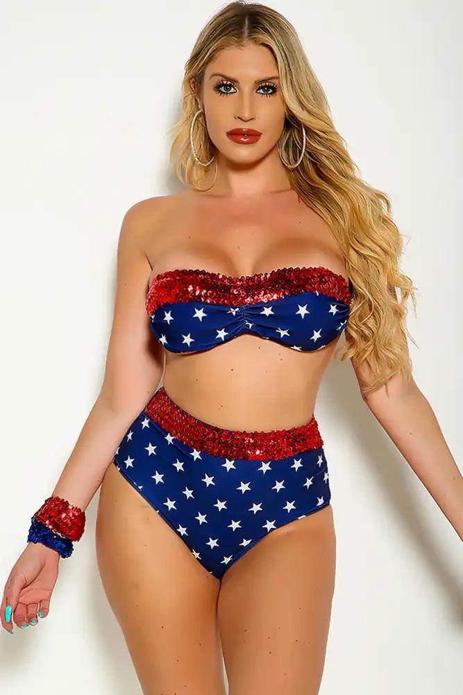 This Swimsuit is perfect for those patriotic holidays we love! Featuring, strapless starprint, sequins trimmed, bandeau, matching high waist bottoms. Followed by a sexy wear. 90% polyester 10% spandex. Please Note Wrist Band is Not included