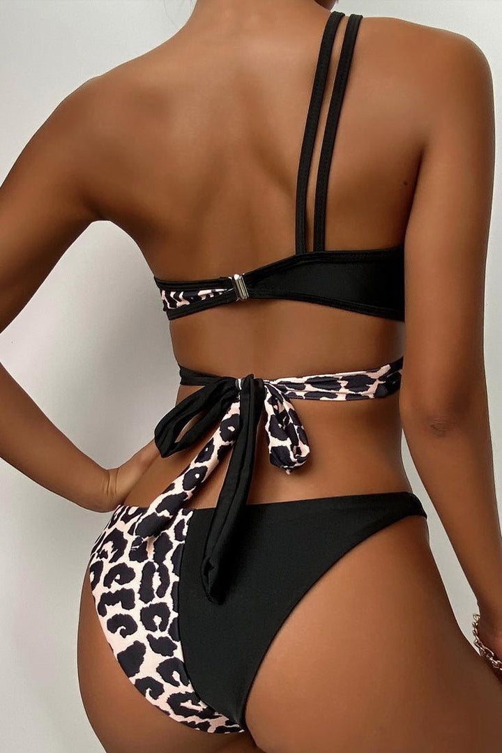 Leopard Black Strappy One Shoulder Two Piece Swimsuit
