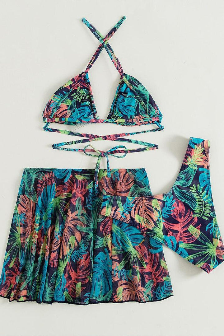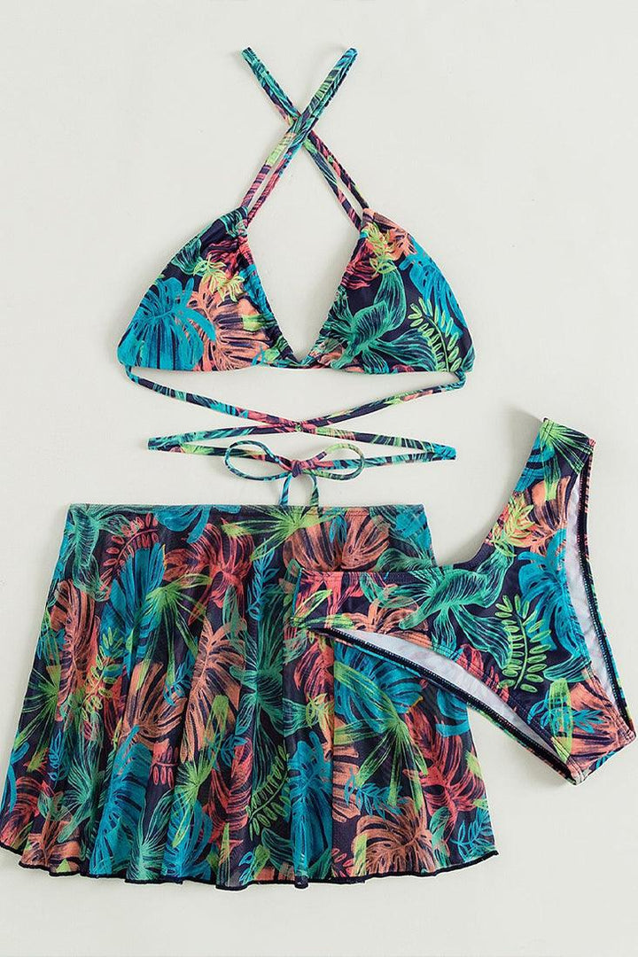 Sexy Multi Color Tropic Tree Print 3pc Bikini With Coverup Skirt